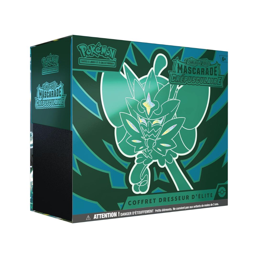 - Chaque Coffret Dresseur d’élite contient un guide de jeu de l’extension Écarlate et Violet – Mascarade Crépusculaire, un coffret de collection avec 4 séparateurs et une carte à code pour le Jeu de Cartes à Collectionner Pokémon Live.